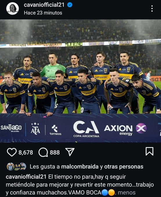 “El tiempo no para. Hay que seguir metiéndole para mejorar y revertir este momento. Trabajo y confianza muchachos, vamos Boca”, escribió el Matador en sus redes, junto a una imagen del equipo formado en el estadio Madre de Ciudades, minutos antes del nuevo tropiezo que dejó al Xeneize sin Copa Argentina y con menos caminos hacia la Libertadores 2026. Un gesto que busca levantar el ánimo interno tras otra caída dolorosa.